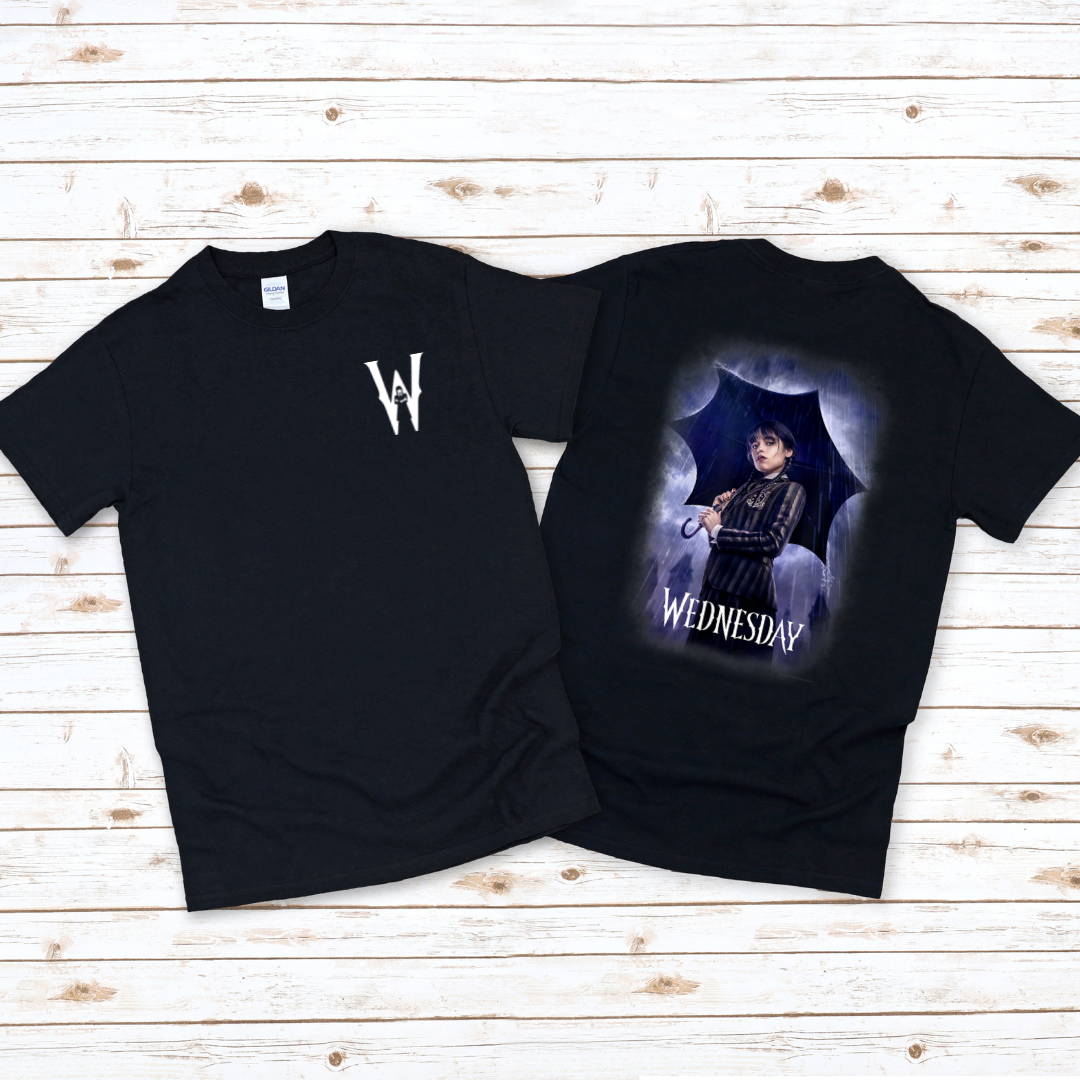 *This listing is for the photo of Wednesday in the rain with the umbrella. There is a separate listing for the coordinating pocket design under "W Addams (white or black)"